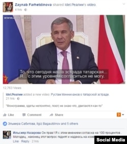Видеоролик, в котором президент Татарстана комментирует качество современной татарской эстрады (создан порталом "Idel.Реалии"), не на шутку всполошил пользователей социальной сети Facebook. Менее чем за сутки ролик набрал более 13 тысяч просмотров - и это только в Facebook.