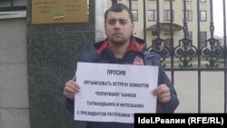"Просим организовать встречу клиентов "лопнувших" банков Татфондбанка и Интехбанка с президентом республики Татарстан", — с таким плакатом вышел активист.