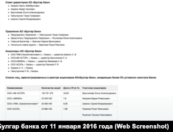 Айдар Амиров владел на тот момент 32,6% банка. Другой крупнейший акционер банка — ООО "Консультационная фирма "Астор" (владела 33,587% акций) — ранее принадлежало Ольге Бронниковой, с 3 марта 2016 года перешел под контроль в равных долях Александра Лимайко и Александра Рекова.