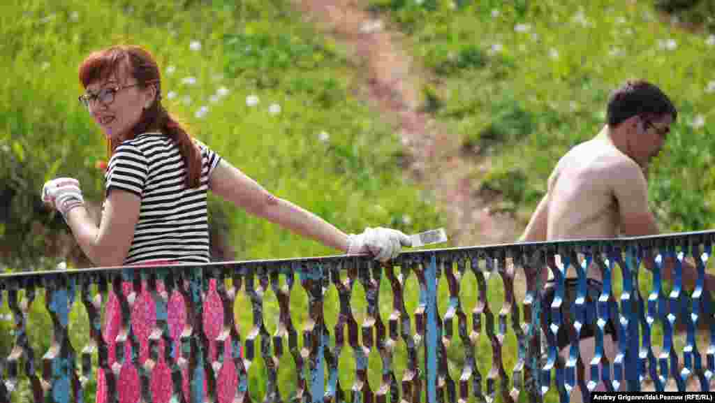 Местные жители принесли скребки, кисти и краски. Остатки ржавчины и старой краски отскабливали, поверх — наносили новую, синюю. Двумя неделями раньше, напомним, люди привели в порядок обмелевший берег под пирсом. Мусора тогда набралось на две грузовые "Газели". Все эти старания, впрочем, могут пойти прахом. Властям города и района не нужен парк на этом месте. Уже найден застройщик территории, который, как подозревают активисты, оставит от рощи с парком одну жалкую аллею.