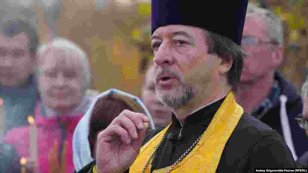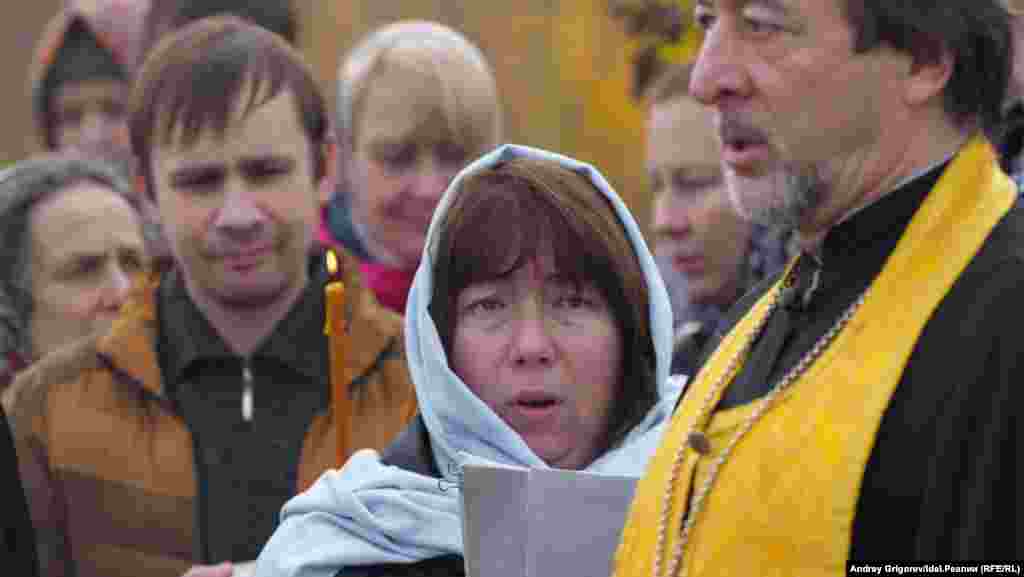После окончания молитвы небольшая группа верующих во главе с председателем Общества русской культуры РТ Михаилом Щеглов добралась до храма-памятника, на катере, предоставленном МЧС.