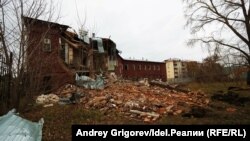 Часть бани — здания 1949 года постройки, подаренной поселку эвакуированным в войну в Казань из Ленинграда оптико-механическим заводом, — разрушена. Стены ощерились провалами. Ветер громыхает железными листами.
