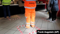 — приближаться к другим людям более чем на 1,5 метра. Это касается улиц, общественного транспорта, магазинов, аптек. Исключение — такси (просто в такси отсесть более чем на 1,5 метра друг от друга не получится). При этом в магазинах и других общественных местах должны быть нанесены специальные разметки, помогающие сохранять социальное дистанцирование, примерно как на этой фотографии:
