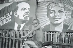 "Это сельский житель на фоне советской агитации. Всё мясо и всё зерно увозили из республики, поэтому в деревнях не очень богато жилось, будем так говорить. И вот мальчик в одних трусиках запечатлен на фоне этих плакатов. Очень сильно была развита агитация, на нее в СССР не жалели. Была такая нарисованная, красивая жизнь. А рядом была совсем другая жизнь, настоящая. И этот мальчик как раз символизирует её".