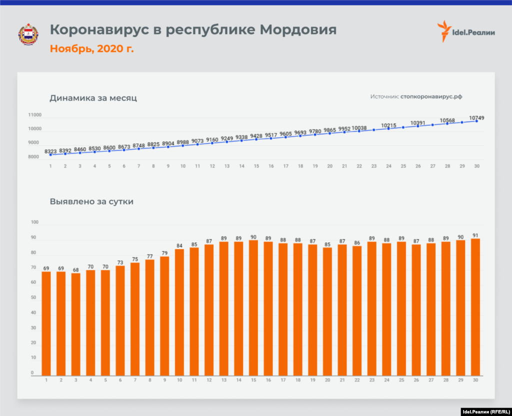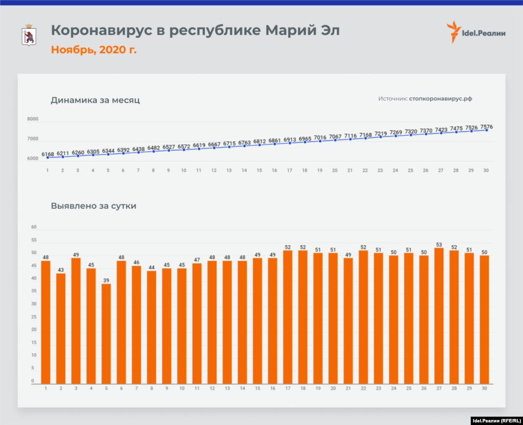 Если в начале месяца в Татарстане ежедневно выявлялось 45 случаев заражения коронавирусной инфекцией, то к концу ноября эта цифра почти удвоилась — до 84-х. В процентном соотношении это наибольший рост среди всех регионов Приволжского федерального округа — наряду с Чувашией и Пермским краем. А вот в Оренбургской и Пензенской областях на протяжении всего месяца цифры практически идентичные: ежедневно выявлялось чуть ли не одинакое количество случаев инфицирования.