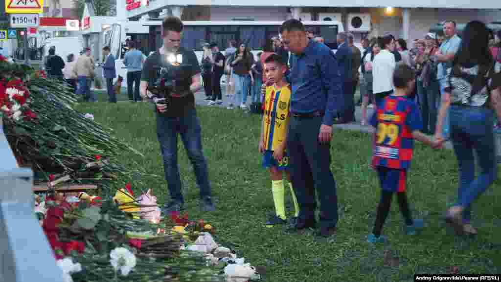 Казанцы до поздней ночи несли цветы, мягкие игрушки и свечи к школе, которая 11 мая подверглась атаке вооруженного ружьём 19-летнего парня. Уже в восемь вечера импровизированный мемориал утопал в цветах и плюшевых мишках. Он был организован на газоне наискосок от школы. К самому учебному заведению многочисленных казанцев не подпускала полиция.