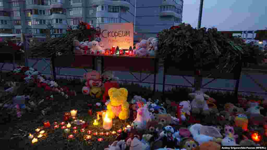 Казанцы до поздней ночи несли цветы, мягкие игрушки и свечи к школе, которая 11 мая подверглась атаке вооруженного ружьём 19-летнего парня. Уже в восемь вечера импровизированный мемориал утопал в цветах и плюшевых мишках. Он был организован на газоне наискосок от школы. К самому учебному заведению многочисленных казанцев не подпускала полиция.
