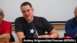 Максим Шевченко в маске цвета партийной символики на встрече в Казани.