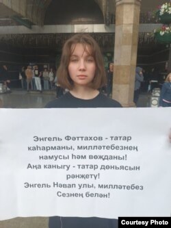 Участница пикета держала в руках плакат на татарском языке, на котором было написано — "Энгель Фаттахов — герой татарского народа, честь и совесть нации. Давление на него — оскорбление всего татарского народа. Энгель Навапович, татарский народ с вами".