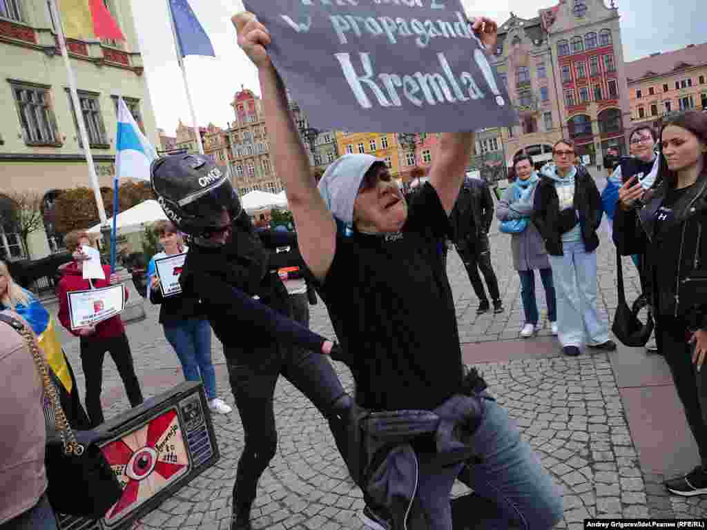 С начала нападения РФ на Украину россияне, живущие во Вроцлаве, проводят у городской ратуши театрализованные акции протеста. Очередная, в сентябре, была посвящена минувшим российским выборам. Участники постановки предлагали прохожим проголосовать.