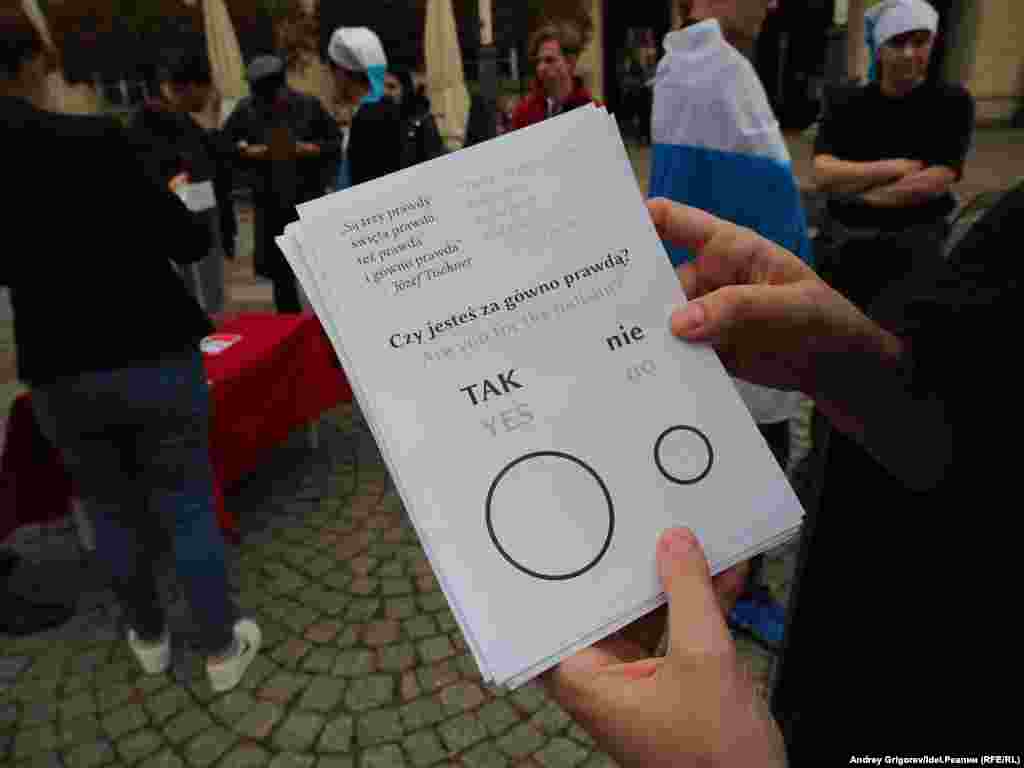 В шапку избирательного бюллетеня был вынесен афоризм польского священника, философа и публициста Юзефа Тишнера: "Есть три вида правды: святая истина, так себе правда и полная брехня" (дословно с польского последнее переводится как говноправда).