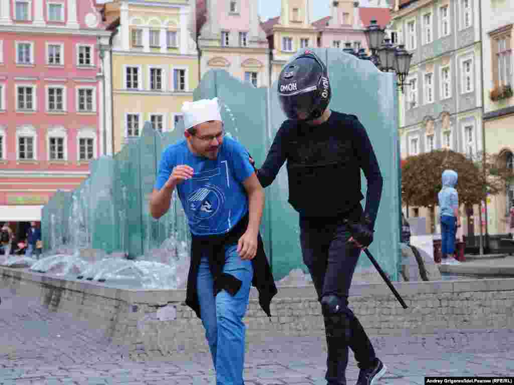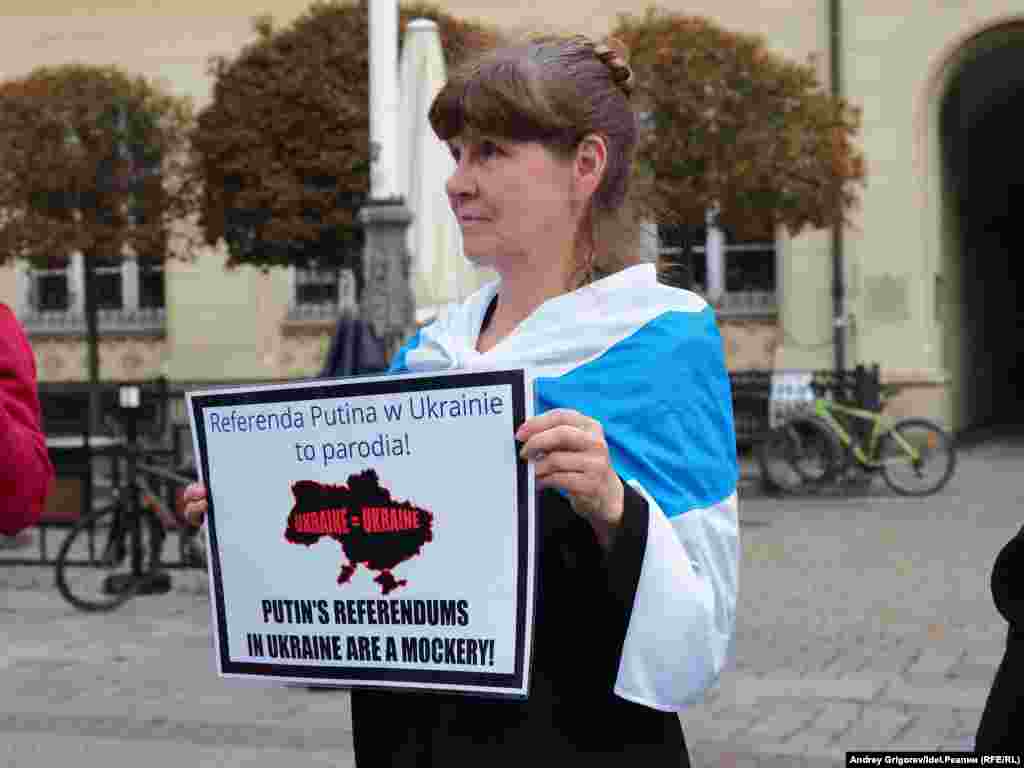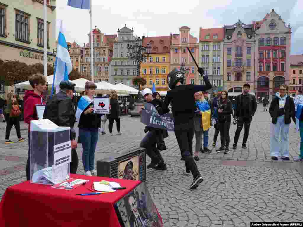 С начала нападения РФ на Украину россияне, живущие во Вроцлаве, проводят у городской ратуши театрализованные акции протеста. Очередная, в сентябре, была посвящена минувшим российским выборам. Участники постановки предлагали прохожим проголосовать.