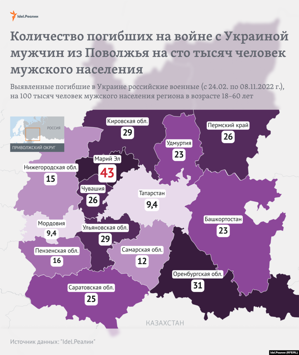 По подсчетам "Idel.Реалии" на 8 ноября 2022 года, на войне погибли как минимум 1 764 человека из республик и областей Поволжья, смерть которых так или иначе признала российская сторона.