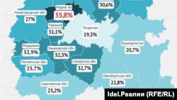 Следом идут Самарская область (30,68%), Саратовская область (29,4%), Удмуртия (28,45%) и Татарстан (25,2%).