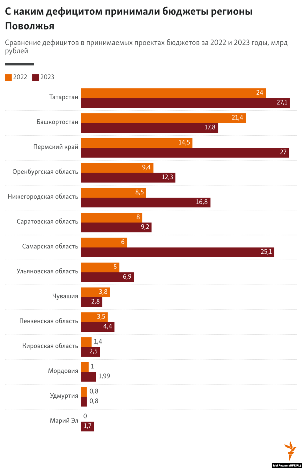 Лидером по росту дефицита в принимаемом годовом бюджете региона за год стала Самарская область — с 6 млрд рублей в 2022 года до 25,1 млрд рублей в 2023 году. Второе место по росту дефицита разделили Пермский край (с 14,5 млрд рублей до 27 млрд рублей) и Нижегородская область (с 8,5 млрд рублей до 16,8 млрд рублей).