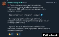 Родственников призывают молчать. Администраторы чата "Крепкий ТЫЛ" в Telegram пишут, что родственникам мобилизованных начали поступать звонки от лиц, представляющихся журналистами. "Просим Вас быть бдительными не отвечать на сомнительные звонки и не передавать личные данные неизвестным людям", — указано в сообщении.
